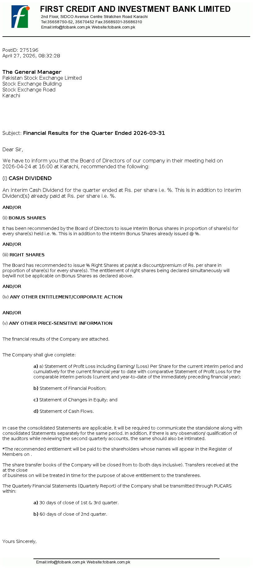 UNUSUAL MOVEMENT IN PRICE OF THE SHARES OF M/S. FRIST CREDIT AND INVESTMENT BANK LIMITED ("FCIBL")